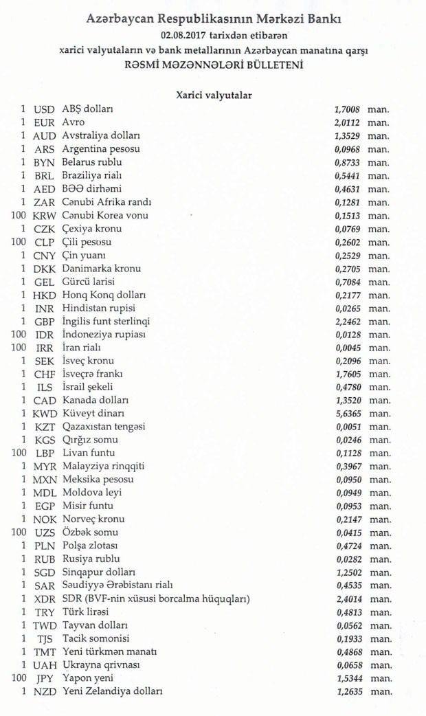 Avqustun 1-də rəsmi olaraq 1 dollar 1,7009 manata, 1 avro isə 2.0122 manata bərabər idi.