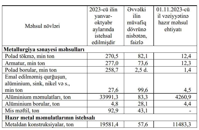 Armatur istehsalı isə azalmışdır. 2023-cü ilin yanvar- oktyabr aylarında 277 min ton armatur istehsal edilmişdir ki, bu da ötən ilin eyni dövrü ilə müqayisədə 26,4 faiz azdır.