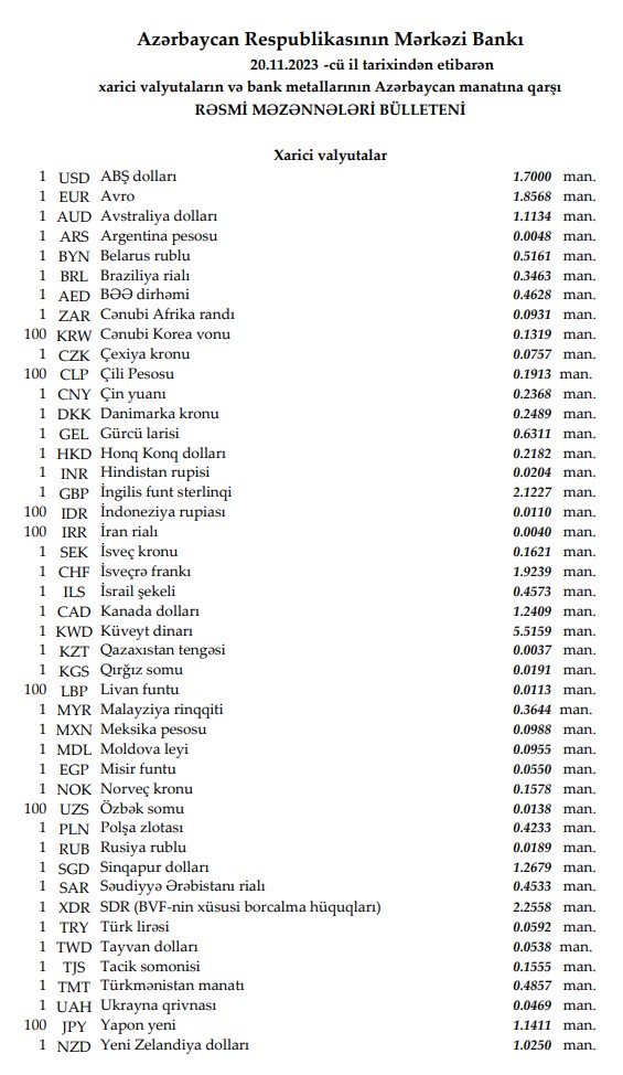 Rəsmi məzənnələr açıqlandı