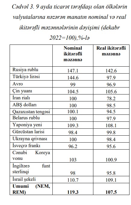 Hesabat dövründə manatın məzənnəsi ticarət tərəfdaşı olan ölkələrin valyutalarına qarşı müxtəlif istiqamətdə dəyişmişdir. Belə ki, manatın məzənnəsi nominal olaraq Türkiyə lirəsinə, Qazaxıstan tengəsinə, Rusiya rubluna, Yaponiya yeninə, Çin yuanına qarşı bahalaşmış, avroya, İngiltərə funt-sterlinqinə, İsveçrə frankına və Gürcüstan larisinə qarşı ucuzlaşmışdır.