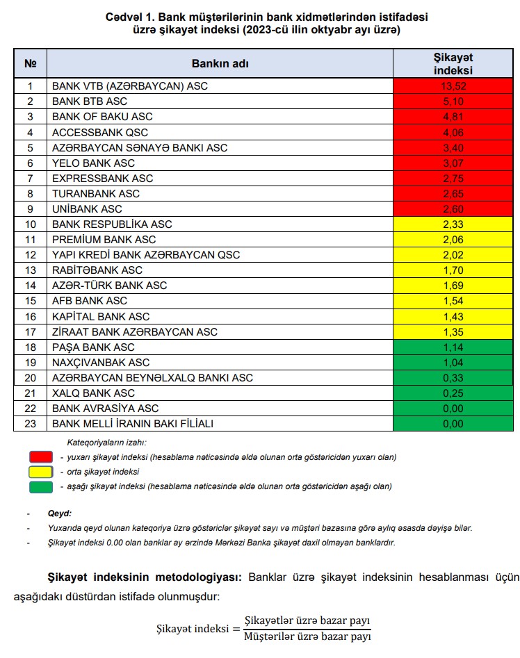 Bank müştərilərinin bank xidmətlərindən istifadəsi üzrə şikayət indeksi (2023-cü ilin oktyabr ayı üzrə)Xidmətlərin göstərilməsi sahəsində, xüsusi ilə də maliyyə sektoru ilə bağlı istehlakçılar tərəfindən bankların özlərinə və ya Mərkəzi Banka təklif, ərizə və şikayətlərin təqdim olunması normal təcrübədir.