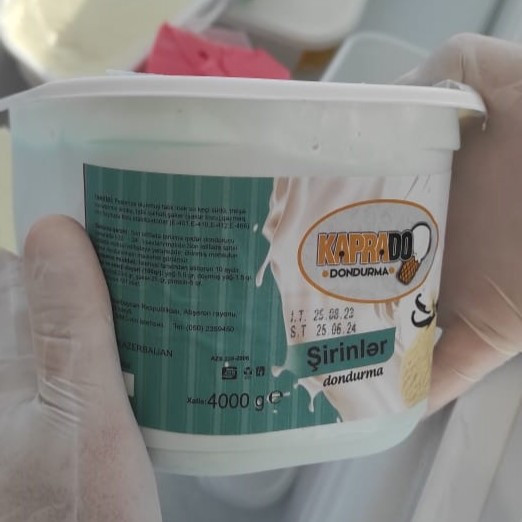 Obyektdə satışı həyata keçirilən “Kapra” MMC-yə məxsus “Kaprado” əmtəə nişanlı müxtəlif çeşidli dondurma məhsullarından nümunələr götürülərək Azərbaycan Qida Təhlükəsizliyi İnstitutunun müvafiq laboratoriyasına təqdim edilib. Müayinələr nəticəsində “Enterobacteriaceae” bakteriyasının normadan yüksək olduğu məlum olub.