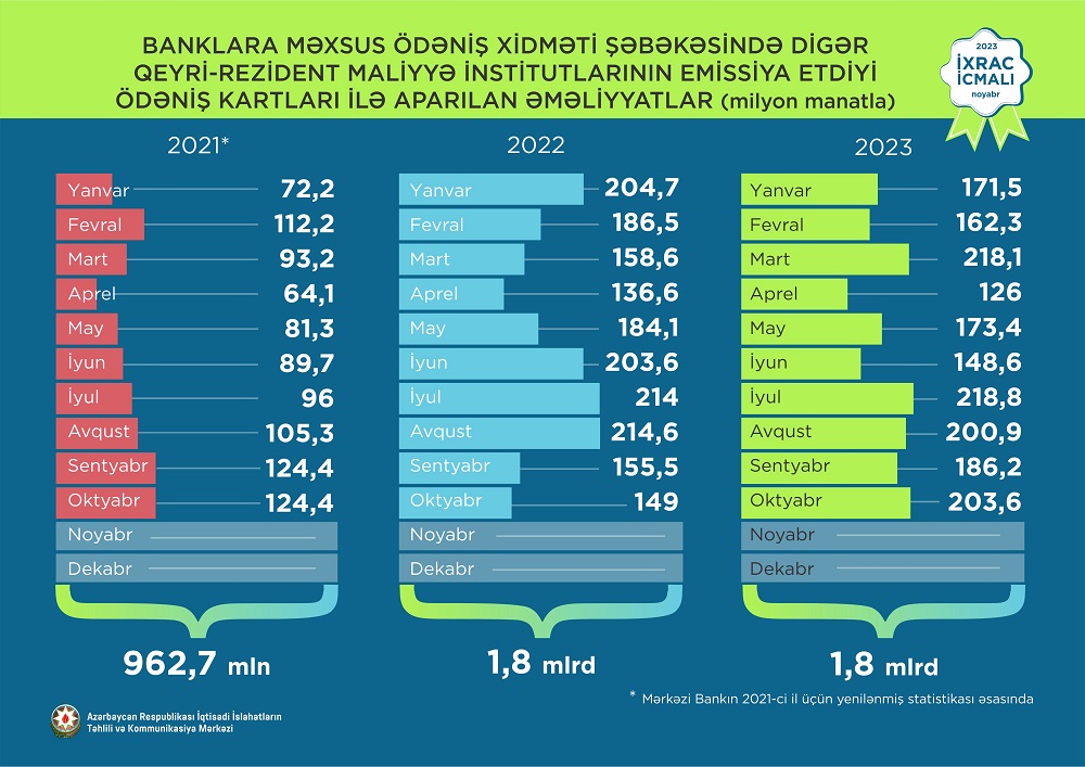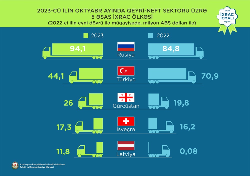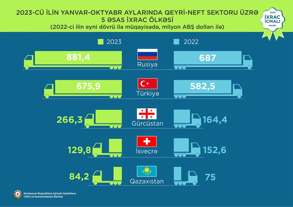 2023-cü ilin yanvar-oktyabr ayları ərzində Rusiya Federasiyasına 881,4 milyon ABŞ dolları, Türkiyəyə 675,9 milyon ABŞ dolları, Gürcüstana 266,3 milyon ABŞ dolları, İsveçrə Konfederasiyasına 129,8 milyon ABŞ dolları, Qazaxıstana isə 84,2 milyon ABŞ dolları dəyərində qeyri-neft sektoruna aid mal ixrac olunub.