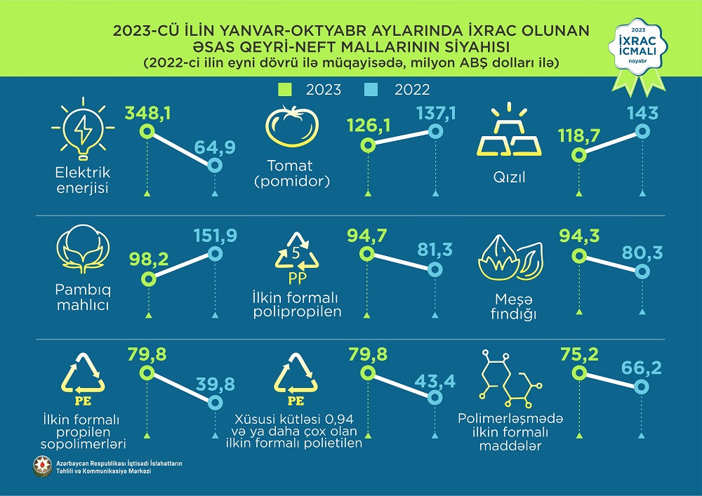 2023-cü ilin yanvar-oktyabr ayları ərzində ixrac edilən qeyri-neft sektoruna aid malların siyahısında elektrik enerjisi (348,1 milyon ABŞ dolları) birinci olub. Bu siyahıda pomidor (tomat) (126,1 milyon ABŞ dolları) ikinci, qızıl (118,7 milyon ABŞ dolları) isə üçüncü yerdə qərarlaşıb.