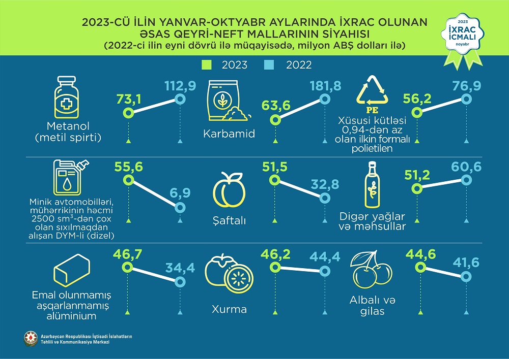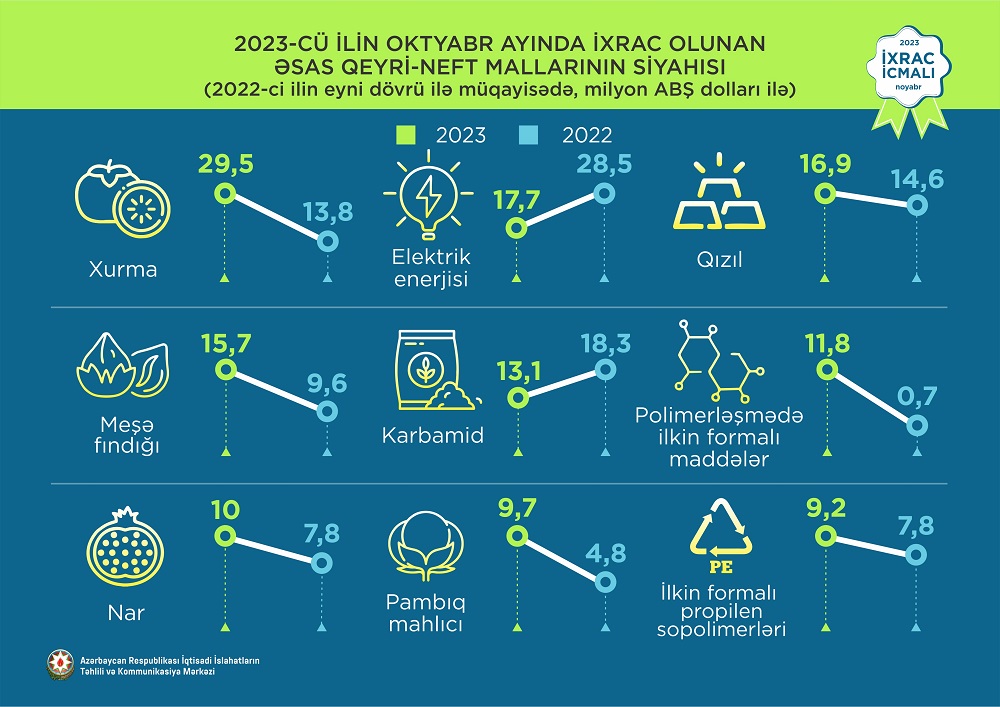 2023-cü ilin oktyabr ayında ixrac edilən qeyri-neft sektoruna aid malların siyahısında xurma (29,5 milyon ABŞ dolları) birinci, elektrik enerjisi (17,7 milyon ABŞ dolları) ikinci və qızıl (16,9 milyon ABŞ dolları) üçüncü olub.