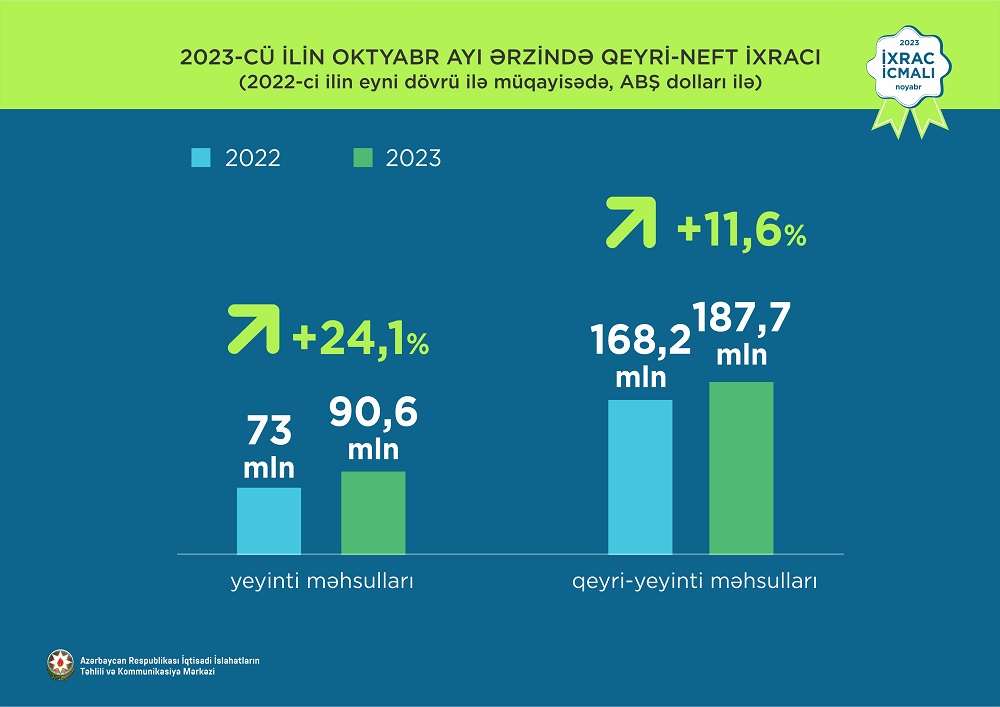 Cari ilin oktyabr ayının qeyri-neft ixracı 15,4% artaraq 278,2 milyon ABŞ dolları olub. Yeyinti məhsulları üzrə ixrac 24,1% artımla 90,6 milyon ABŞ dolları, qeyri-yeyinti məhsulları üzrə ixrac isə 11,6% artımla 187,7 milyon ABŞ dolları təşkil edib.