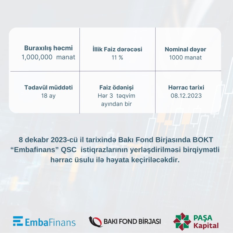 Birjanın yaydığı məlumatda bildirilir ki, 8 dekabr 2023-cü il tarixində Bakı Fond Birjasında BOKT “Embafinans” QSC istiqrazlarının yerləşdirilməsi birqiymətli hərrac üsulu ilə həyata keçiriləcəkdir.