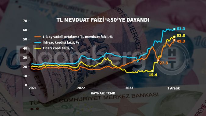 Türkiyə Cümhuriyyəti Mərkəzi Bankının (TCMB) faiz artırması ilə paralel olaraq depozit (əmanət) faizləri də artaraq 50 faizə yaxınlaşıb.