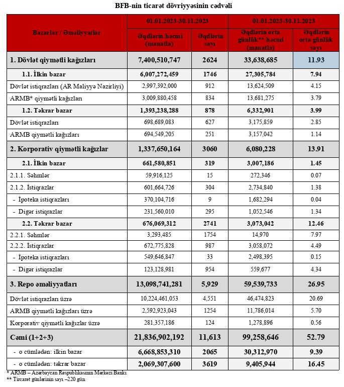 Bakı Fond Birjasında 2023-cü ilin yanvar-noyabr ayları ərzində qiymətli kağızlar üzrə keçirilən əməliyyatların ümumi həcmi 21 milyard 836 milyon 902 min manat təşkil edib.