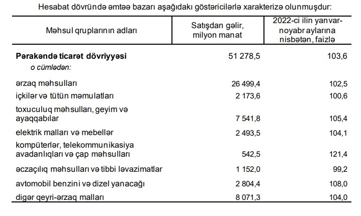 Dövlət Statistika Komitəsinin yaydığı məlumata görə, 2022-ci ilin yanvar-noyabr ayları ilə müqayisədə pərakəndə ticarət dövriyyəsi real ifadədə 3,6 faiz, o cümlədən ərzaq məhsulları, içkilər və tütün məmulatları üzrə 2,4 faiz, qeyri-ərzaq malları üzrə 5,1 faiz artmışdır.
