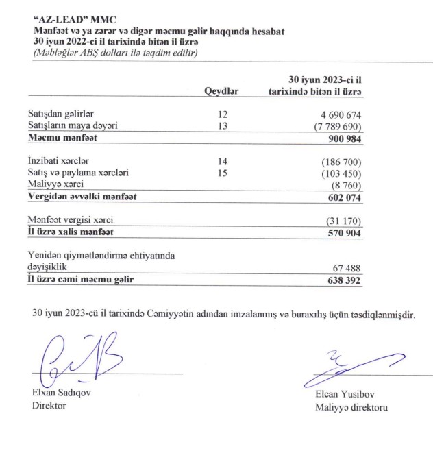 2022-ci ildə "Az-Lead" şirkətinin satışdan gəlirləri 11 milyon 454 min dollar təşkil etmişdi.
