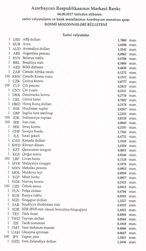 Avqustun 3-də rəsmi olaraq 1 dollar 1,7008 manata, 1 avro isə 2.0149 manata bərabər idi.