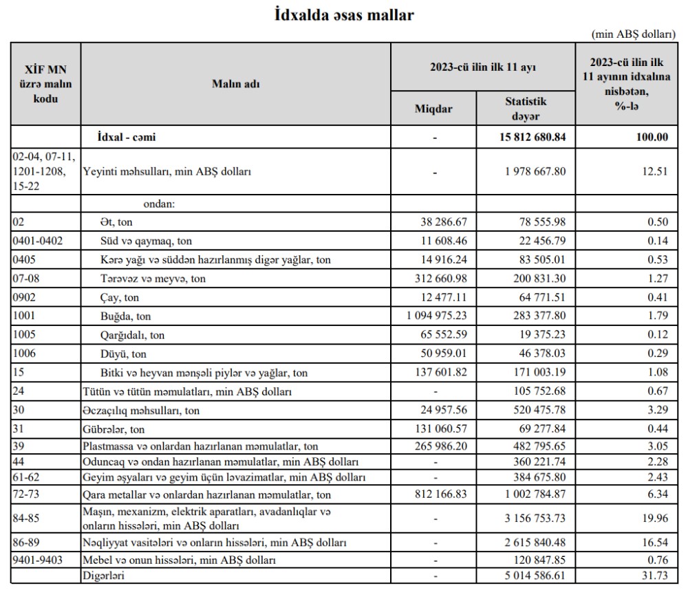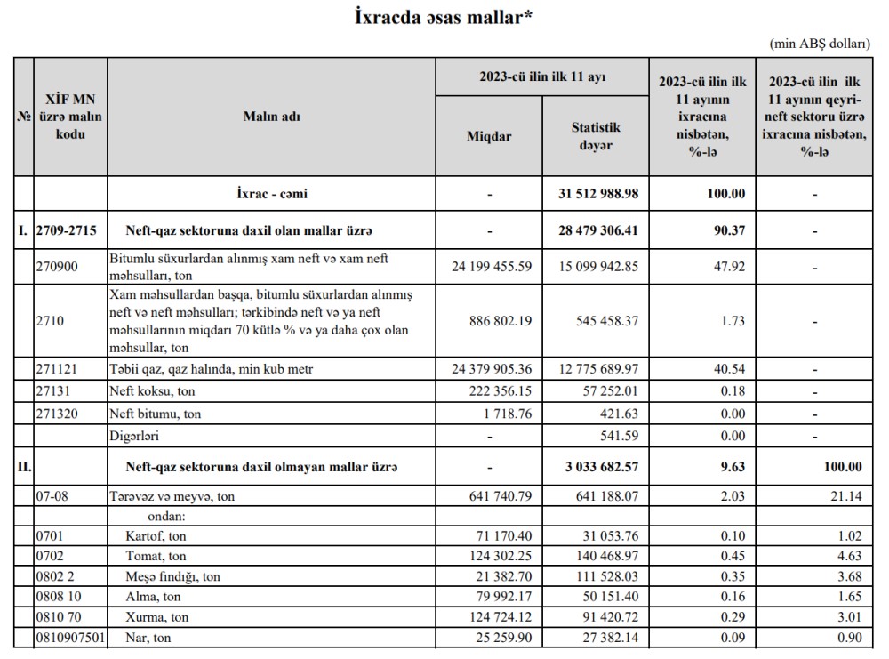 2023-cü ilin yanvar-noyabr aylarında (11 ayda) Azərbaycanın ən çox ixrac və idxal etdiyi mallar.