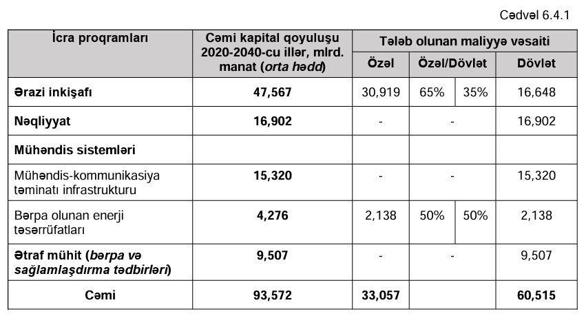 Sənədə əsasən, bunun 60,5 milyard manatı dövlət büdcəsindən ayrılacaq, qalan 33,1 milyard manatı isə özəl sektorun payına düşəcək.