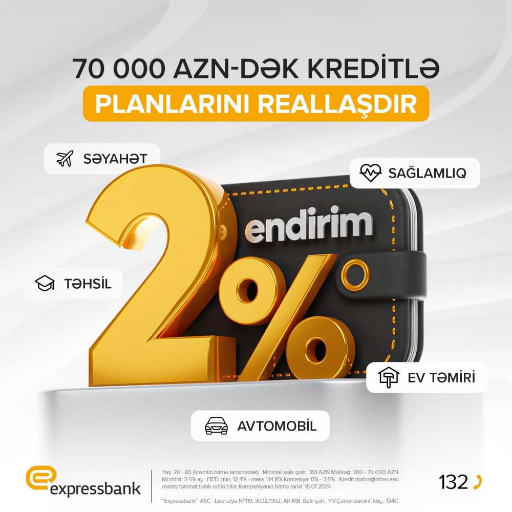 Expressbank-dan 70 000 AZN-dək nağd krediti illik 9,5%-dən başlayan şərtlərlə əldə et. Yanvarda kredit sifariş edən şəxslər əsas məbləğ üzrə ödənişə aprel ayında başlaya bilərlər.