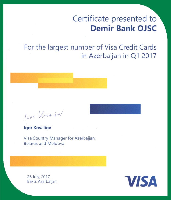 “Visa İnternational” beynəlxalq ödəniş sistemi tərəfindən DəmirBank 2017-ci ilin 1-ci rübü üçün ən çox Visa kredit kartı təqdim etmək üzrə birinci yerə layiq görülərək, (For the largest number of Visa Credit Cards in Azerbaijan in Q1 2017) sertifikat ilə təltif olunub.