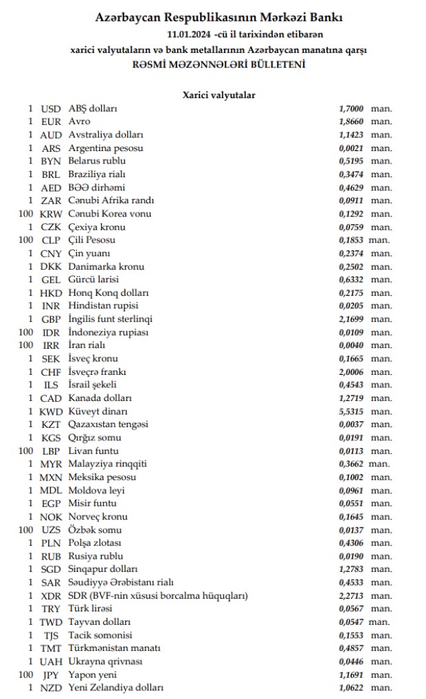 Rəsmi məzənnələr açıqlandı
