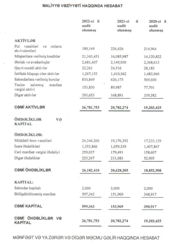 Lombard və lizinq bazarında fəaliyyət göstərən "Kredit Evi" ASC 2022-ci ili 1 milyon 361 min manat xalis mənfəət ilə başa vurub.