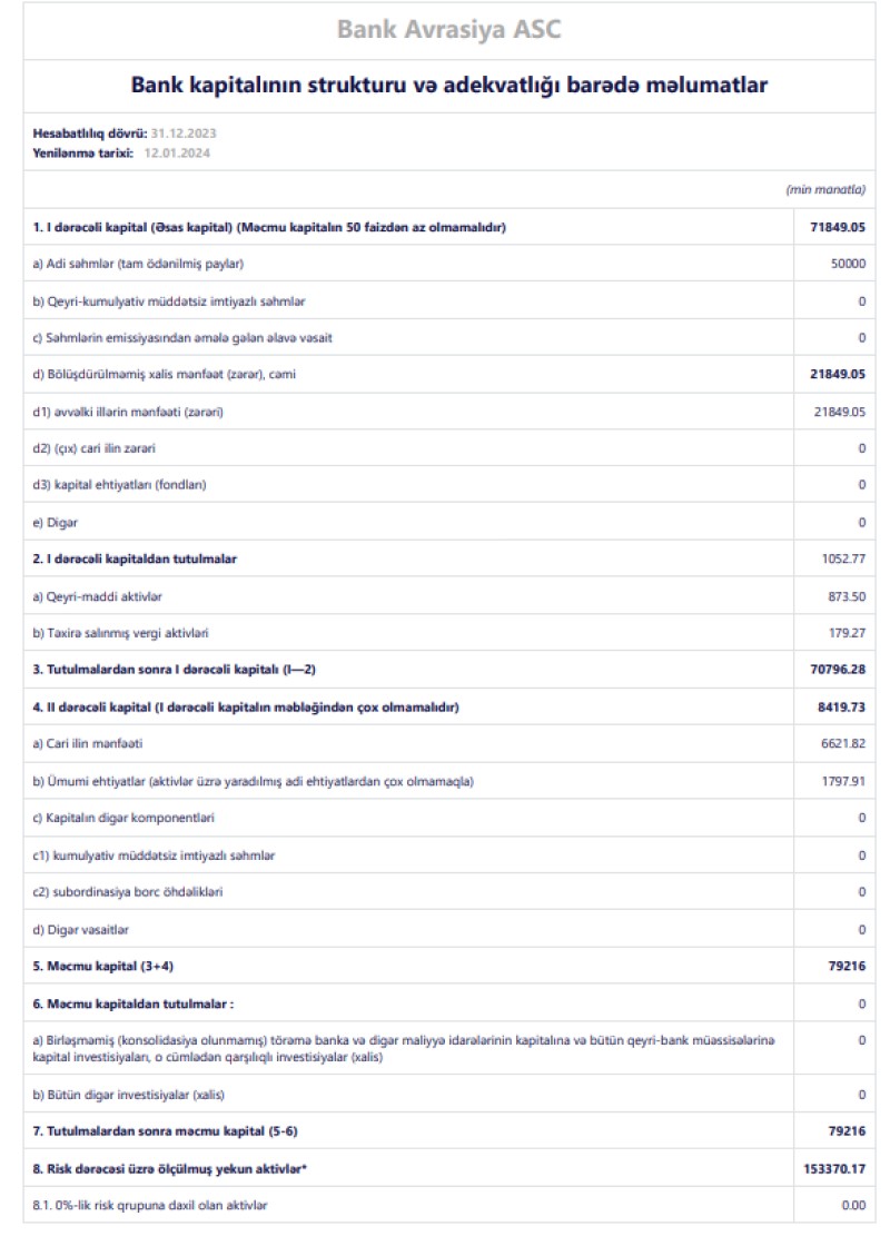 31 dekabr 2023-cü il tarixində "Bank Avrasiya" 79 milyon 216 min manat məcmu kapitala malik olub.