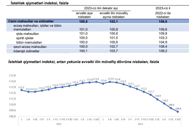 2023-cü ilin dekabr ayında istehlak qiymətləri indeksi əvvəlki aya nisbətən 0,5 faiz, əvvəlki ilin dekabr ayına nisbətən 2,1 faiz təşkil artıb.