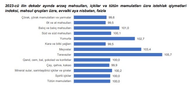 2023-cü ilin dekabr ayında ərzaq məhsulları, içkilər və tütün məmulatları üzrə istehlak qiymətləri indeksi əvvəlki aya nisbətən 1 faiz, əvvəlki ilin dekabr ayına nisbətən 0,8 faiz yüksəlib.