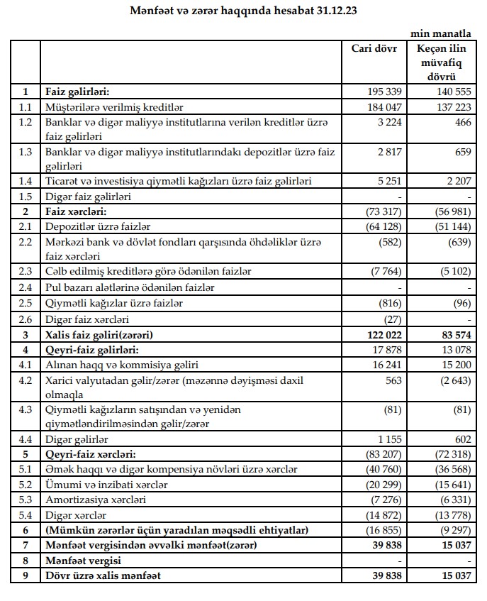 Faiz gəlirləri 2022-ci il ilə müqayisədə 39.0% artaraq 195.3 milyon manat təşkil edib. Xalis faiz gəlirləri isə 2022-ci il ilə müqayisədə 46.0% artaraq 122.0 milyon manata yüksəlib.