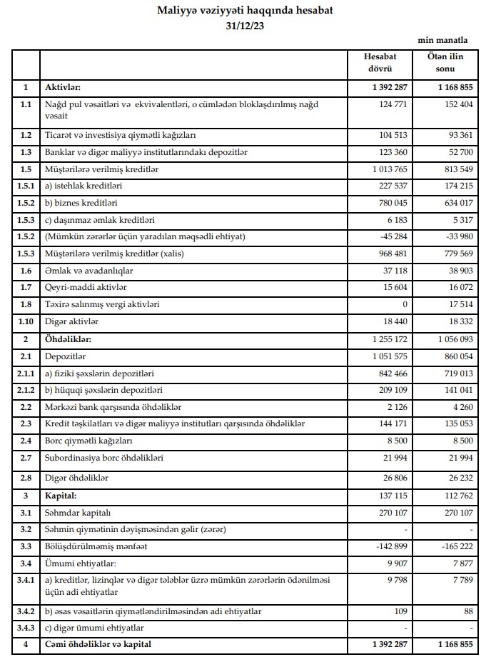 -Bankın aktivləri 1.4 milyard manata yüksəlib ki, bu da 2022-ci illə müqayisəsədə 19.1% çoxdur.