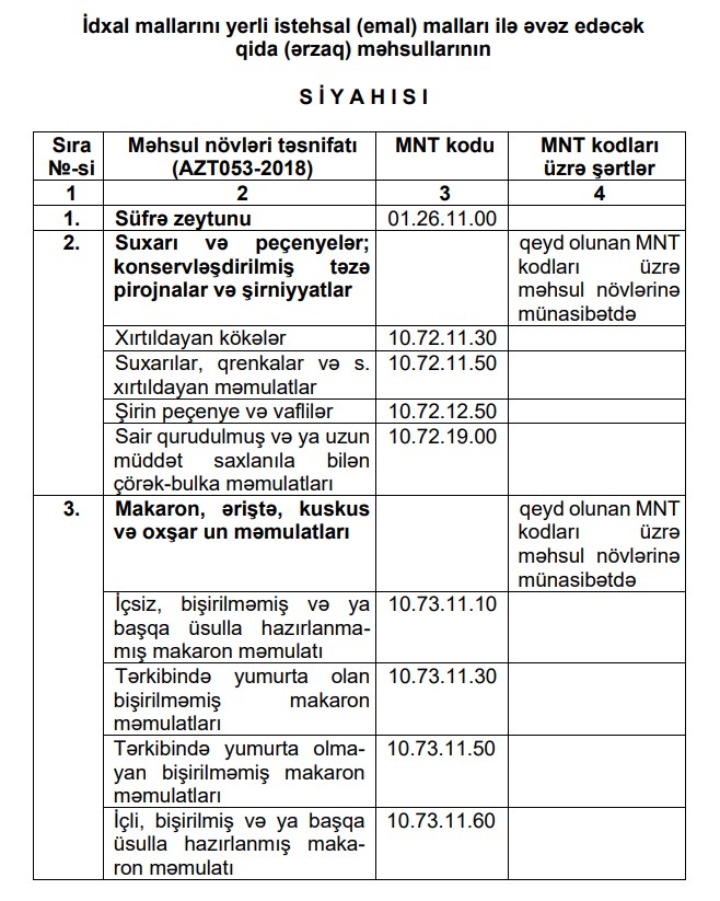 İdxal mallarını yerli istehsal (emal) malları ilə əvəz edəcək qida (ərzaq) məhsullarının S İ Y A H I S I
