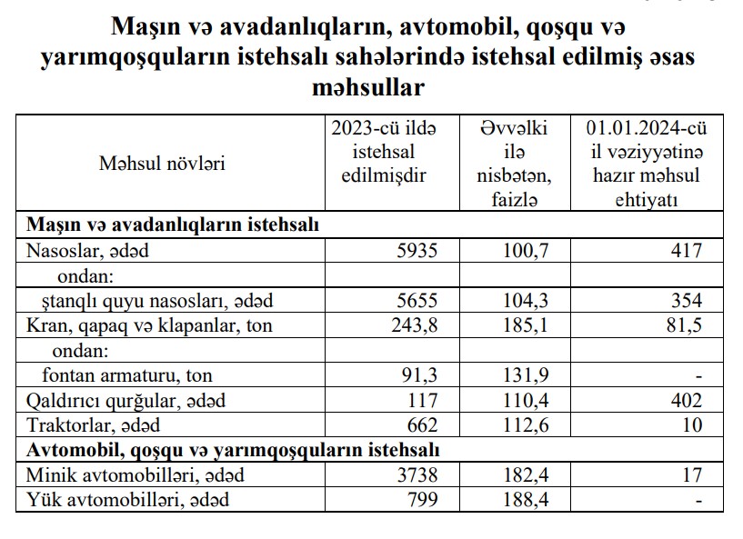 2023-cü ildə Azərbaycanda 799 ədəd yük avtomobili yığılıb ki, bu da 2022-ci illə müqayisədə 88,4% artıb.