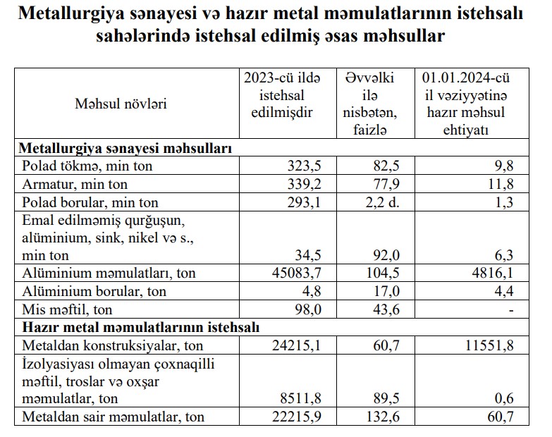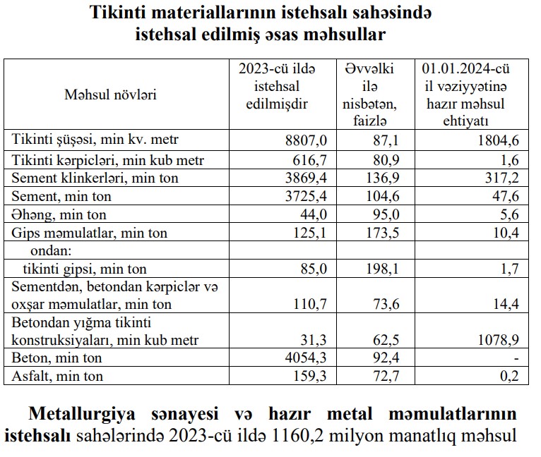 Qeyd edilib ki, dövr ərzində tikinti gipsinin istehsalı 98,1 faiz, gips məmulatlarının istehsalı 73,5 faiz, sement klinkerlərinin istehsalı 36,9 faiz, sement istehsalı 4,6 faiz artmışdır.