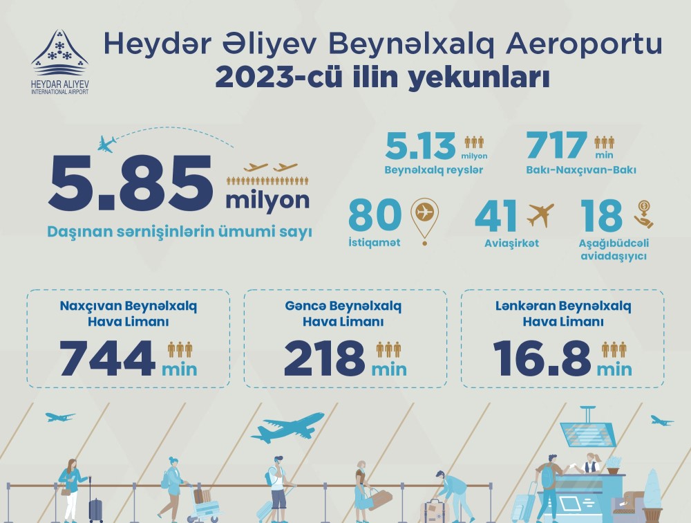 Bakı hava limanında 2023-cü ildə sərnişin axını tarixi səviyyəyə çatıbÖlkənin əsas hava qovşağı olan Heydər Əliyev Beynəlxalq Aeroportunda sərnişin dövriyyəsi 2023-cü ildə rekord həddə yüksəlib - 5,85 milyondan çox sərnişinə xidmət göstərilib.
