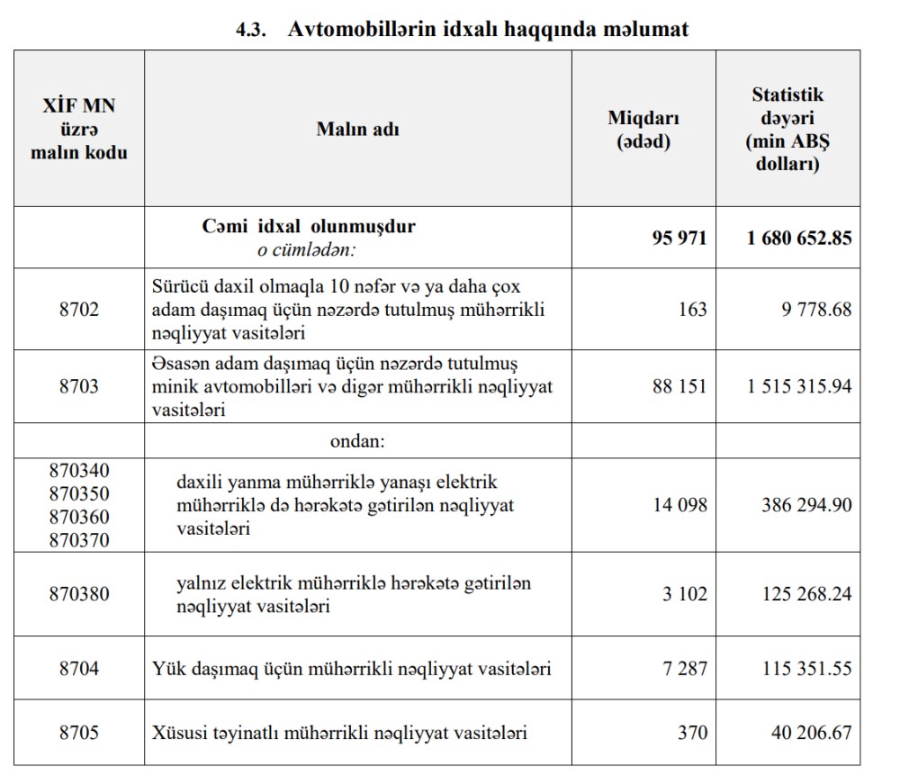 Müqayisə üçün qeyd edək ki, 2022-ci ildə Azərbaycana 1 milyard 57 milyon 792 min dollar dəyərində 74 min 577 ədəd nəqliyyat vasitəsi, o cümlədən 844 milyon 720 min dollar dəyərində 68 min 684 ədəd minik avtomobili idxal olunmuşdu.