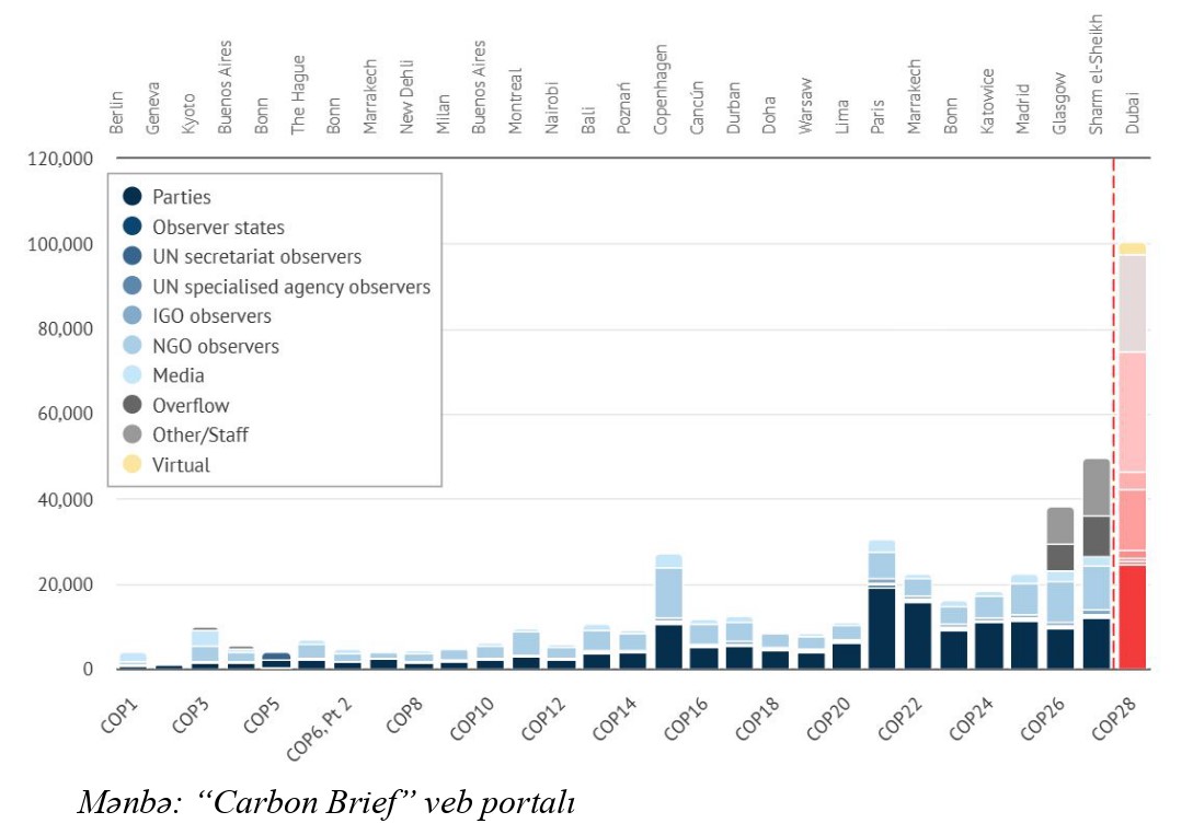 Bəs nəyə görə COP29 bu qədər vacib və əhəmiyyətli tədbirdir? İqlim dəyişiklikləri üzrə iqtisad və hüquq sahəsində ixtisaslaşmış Britaniyanın “Carbon Brief” veb portalının verdiyi məlumata əsasən sonuncu COP28-də təxminən 100 000-ə yaxın rəsmi qeydiyyatdan keçmiş ziyarətçi iştirak etmişdir. Qonaqlar sırasında tərəfdaş ölkələrin nümayəndə heyətləri, çoxsaylı müşahidəçi statusuna sahib olan iştirakçılar, çox sayda media nümayəndələri və virtual ziyarətçilərin olduğunu əks etdirən məlumatı aşağıdakı diaqramdan da müşahidə etmək mümkündür.