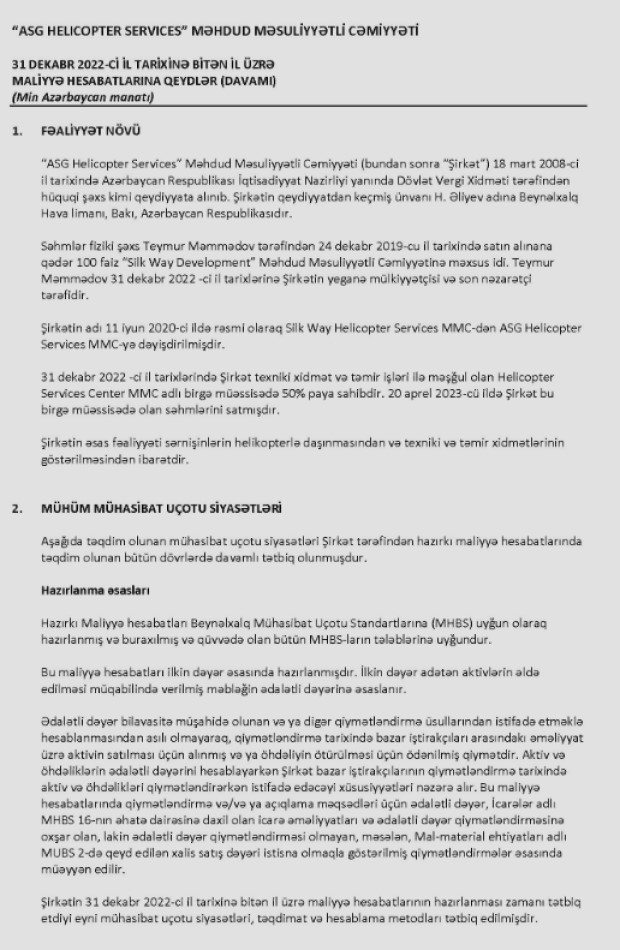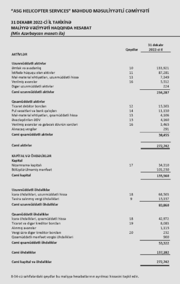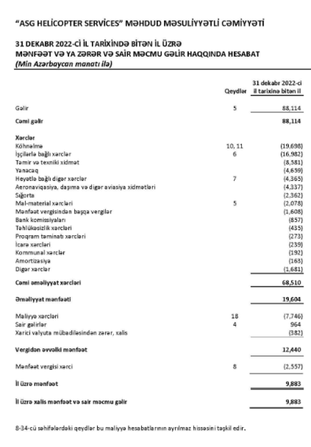Azərbaycanın aviasiya şirkəti "ASG Helicopter Services" 2022-ci ili 9 milyon 883 min manat xalis mənfəət ilə başa vurub.