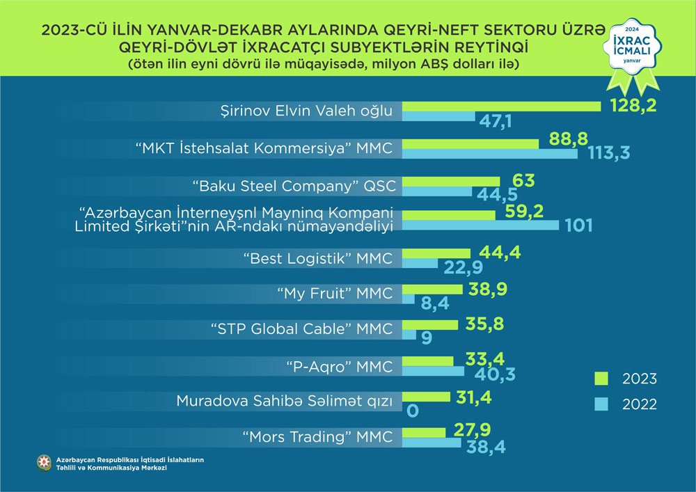 2023-cü ilin yanvar-dekabr ayları üzrə hazırlanan qeyri-dövlət ixracatçı subyektlərin reytinqində ilk onluqda aşağıdakı şirkətlər təmsil olunurlar: