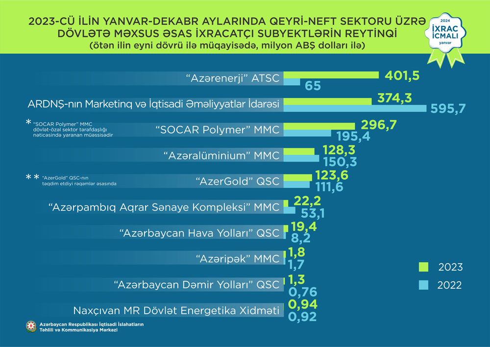 Qeyri-neft sektoru üzrə ixrac əməliyyatlarında iştirak edən dövlətə məxsus olan şirkətlərin siyahısına isə “Azərenerji” ATSC başçılıq edir. Daha sonra bu siyahıda aşağıdakı şirkətlər təmsil olunurlar: