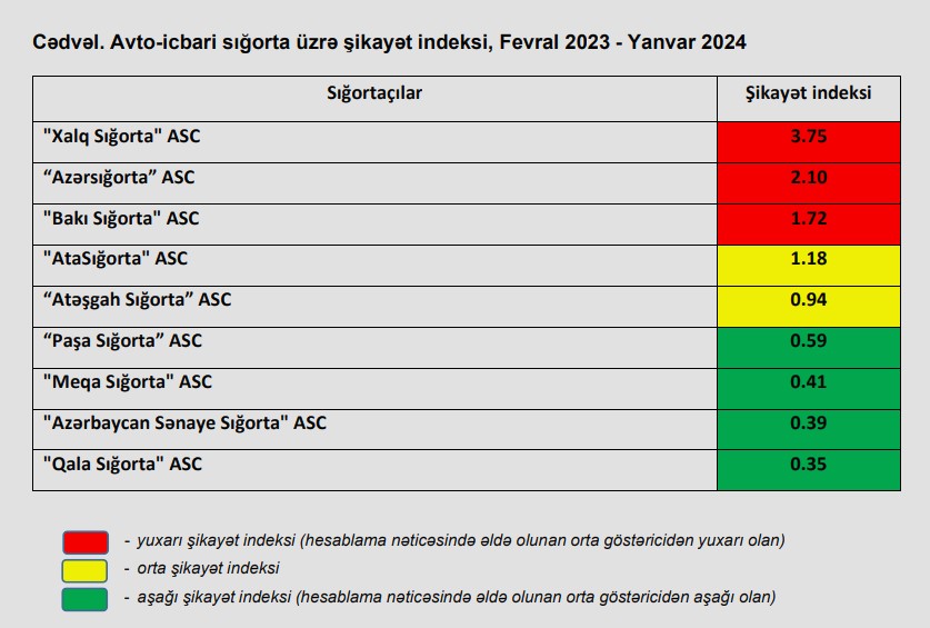 Avto-icbari sığorta üzrə şikayət indeksi vətəndaşların bu növ üzrə sığorta xidmətlərini əldə edərkən seçim etmələrinə dəstək göstərilməsi məqsədilə hesablanılır və yayımlanır. Şikayət indeksinin hesablanmasında beynəlxalq səviyyədə istifadə olunan metodologiyaya əsaslanaraq avto-icbari sığorta növünün aparılması üzrə verilən icazənin ləğv edilməsi yolu ilə lisenziyasının qüvvəsi məhdudlaşdırılmış “AZSIĞORTA” ASC-nin, "İpək Yolu Sığorta"ASC-nin, "A-Qroup Sığorta" ASC-nin və lisenziyası ləğv olunmuş "Günay Sığorta" ASC və “Naxçıvansığorta” ASC-nin müqavilə sayları və şikayət sayları hesablamada nəzərə alınmamışdır. Lakin, qeyd olunan şirkətlərlə bağlanılmış və qüvvədə olan avto-icbari sığorta üzrə mövcud müqavilələrlə bağlı daxil olan şikayətlərin tənzimlənməsi Mərkəzi Bank tərəfindən əvvəlki qaydada davam etdirilir.