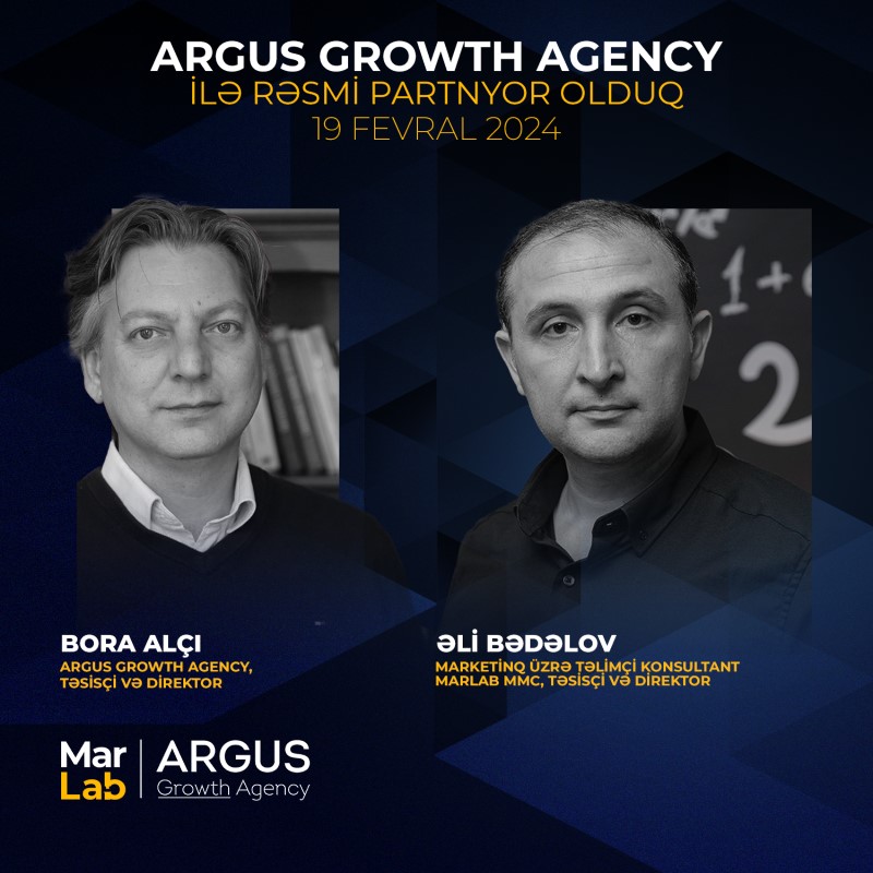 Brendin inkişafı, kateqoriya menecmenti, satış kanallarının idarəedilməsi, müştəri təcrübəsinin yaxşılaşdırılması, dəyər zəncirinin dizaynı üzrə həllər axtaran yerli şirkətlərimiz aşağıdakı əlaqə məlumatları üzrə MarLab agentliyinə müraciət edə bilərlər.Bundan sonra Azərbaycanın marketinq agentliyi MarLab MMC Türkiyənin məşhur “Argus Pazar Arastirma ve Danismanlik Limited” (Argus Growth Agency) şirkətini Azərbaycanda təmsil edəcək.