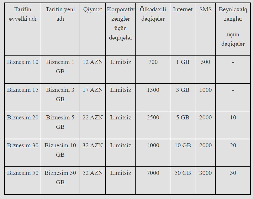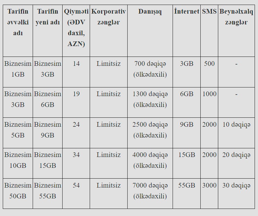 25 mart 2024-cü il tarixdən etibarən “Biznesim 1GB” tarifi “Biznesim 3GB” (+ 2GB), “Biznesim 3GB” tarifi “Biznesim 6GB” (+3GB), “Biznesim 5GB” tarifi "Biznesim 9GB" (+4GB), “Biznesim 10GB” tarifi "Biznesim 15GB" (+5) və “Biznesim 50GB” tarifi "Biznesim 55GB" (+5GB) adlanacaq. Qiymətlər isə 12 AZN, 17 AZN, 22 AZN, 32 AZN və 52 AZN deyil, müvafiq olaraq 14 AZN, 19 AZN, 24 AZN, 34 AZN və 54 AZN təşkil edəcəkdir.