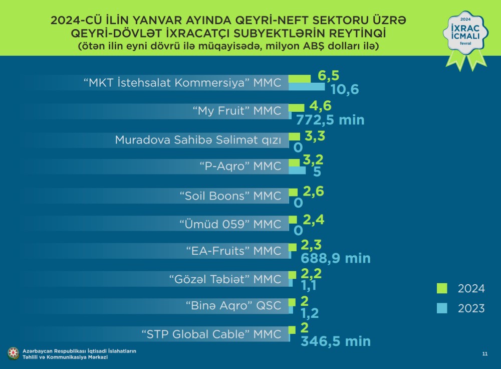 Marja.az "İxrac icmalı -2024/Fevral"a istinadən xəbər verir ki, 2024-cü ilin yanvar ayı üzrə hazırlanan qeyri-dövlət ixracatçı subyektlərin reytinqində ilk onluqda aşağıdakı şirkətlər təmsil olunurlar: