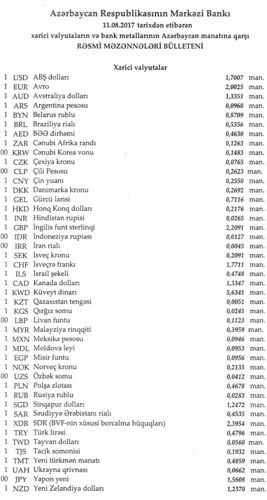 Avqustun 10-da rəsmi olaraq 1 dollar 1,7007 manata, 1 avro isə 1.9960 manata bərabər idi.