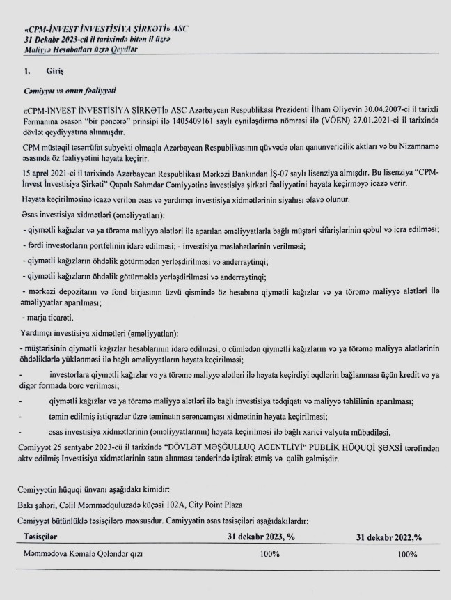 "CPM İnvest İnvestisiya Şirkəti" ASC 2021-ci ilin 15 Aprel tarixində lisenziya alaraq fəaliyyətə başlayıb.