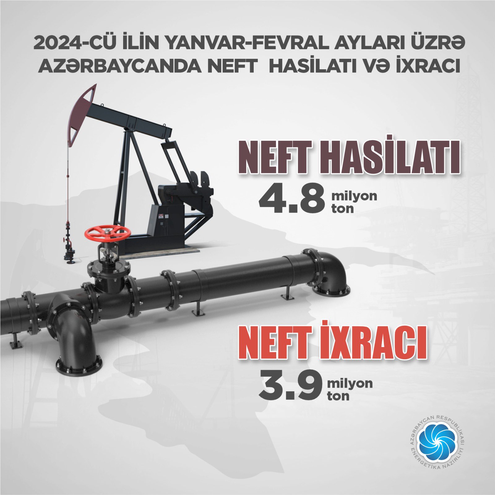 2024-cü ilin yanvar-fevral ayları üzrə ölkədə 4,8 milyon ton neft (kondensatla birlikdə) hasil edilib. Neft hasilatının 2,7 milyon tonu “Azəri-Çıraq-Günəşli”nin, 0,7 milyon tonu (kondensat) “Şahdəniz”in, 96 min tonu (kondensat) “Abşeron” yatağının payına düşüb. SOCAR üzrə neft (kondensatla birlikdə) hasilatı 1,3 milyon ton təşkil edib.