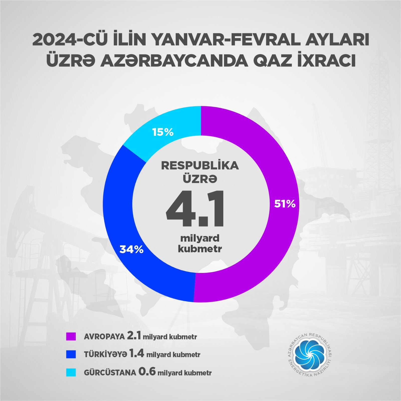Bu ilin yanvar - fevral aylarında Avropaya 2,1 mlrd.m3, Türkiyəyə 1,4 mlrd.m3, Gürcüstana isə 0.6 mlrd.m3 qaz ixrac olunub. Bu dövrdə TANAP-la Türkiyəyə 0.8 mlrd.m3 qaz nəql edilib.