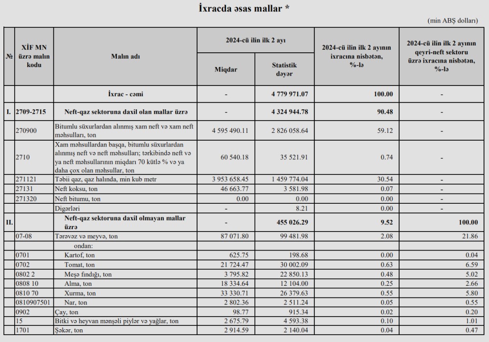 2024-cü ilin ilk 2 ayı ərzində (yanvar-fevral) Azərbaycandan neft-qaz sektoruna daxil olmayan mallar üzrə ixracın cəmi dəyəri 455 milyon 26 min dollar təşkil edib.