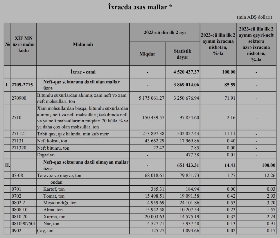 2023-cü ilin ilk 2 ayı ərzində neft-qaz sektoruna daxil olmayan mallar üzrə ixracın dəyəri 651 milyon 423 min dollar olmuşdu.