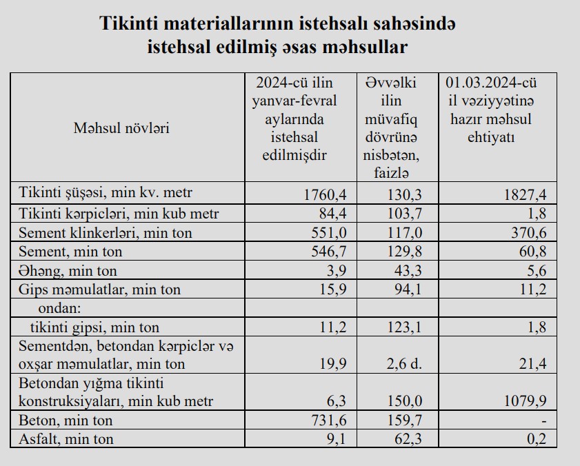 Tikinti materiallarının istehsalı sahəsində 2024-сü ilin yanvar-fevral aylarında istehsalın ümumi dəyəri 173,9 milyon manat olmaqla, əvvəlki ilin müvafiq dövrü ilə müqayisədə 35,1 faiz artmışdır.
