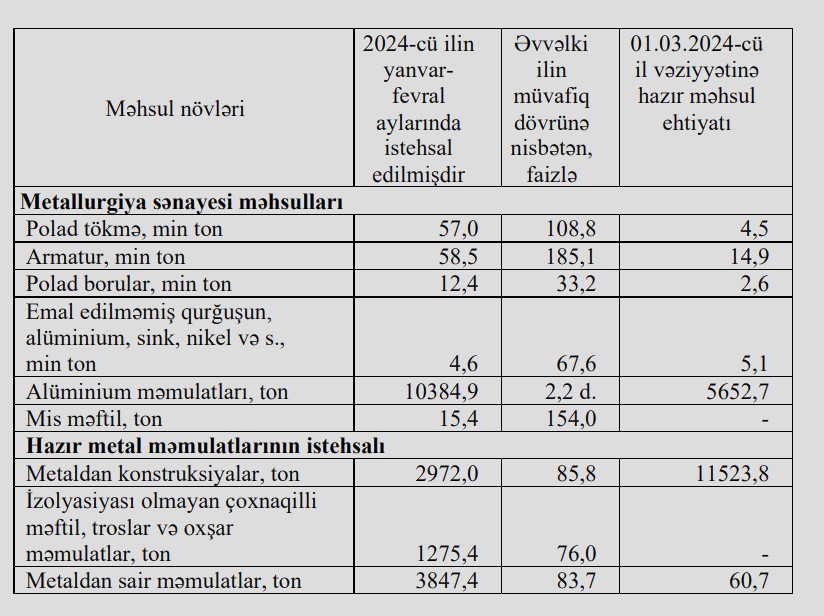 2024-cü ilin yanvar-fevral aylarında 58,5 min ton armatur istehsal edilmişdir. İstehsal ötən ilin eyni dövrü ilə müqayisədə 85,1% artıb.*