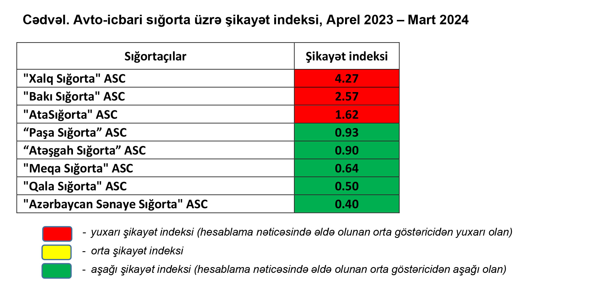 Aşağı şikayәt indeksində isə "Azərbaycan Sənaye Sığorta" ASC, "Qala Sığorta" ASC, "Meqa Sığorta" ASC, “Atəşgah Sığorta” ASC və “Paşa Sığorta” ASC yer tutublar.