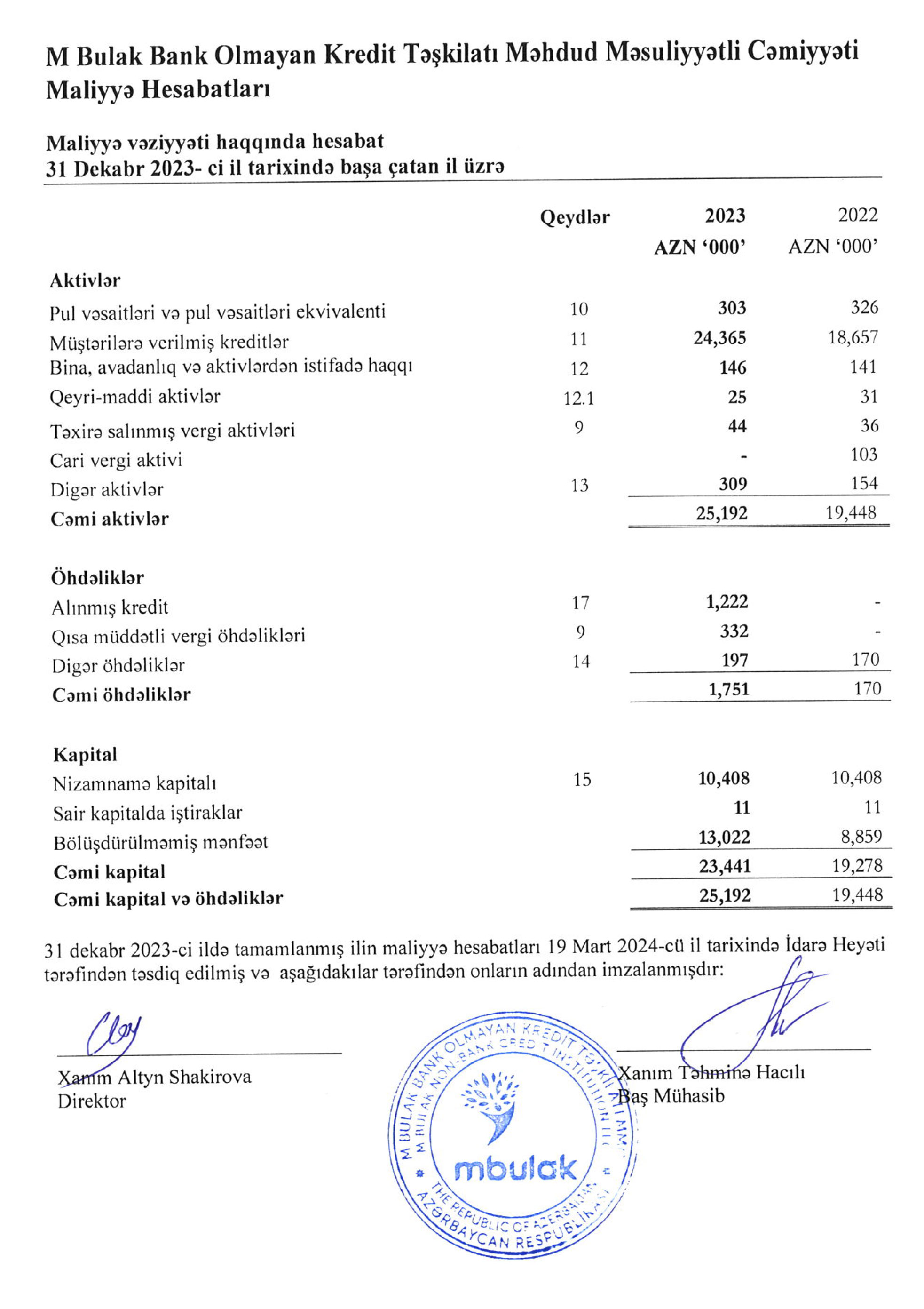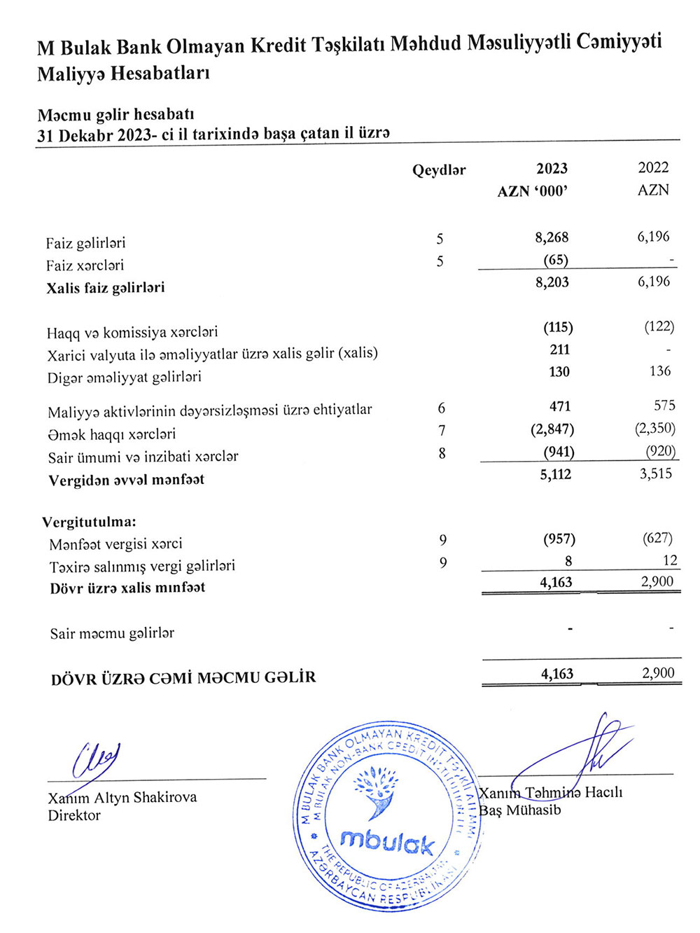 “M Bulak” Bank Olmayan Kredit Təşkilatı 2023-cü ili 4 milyon 163 min manat xalis mənfəət ilə başa vurub.